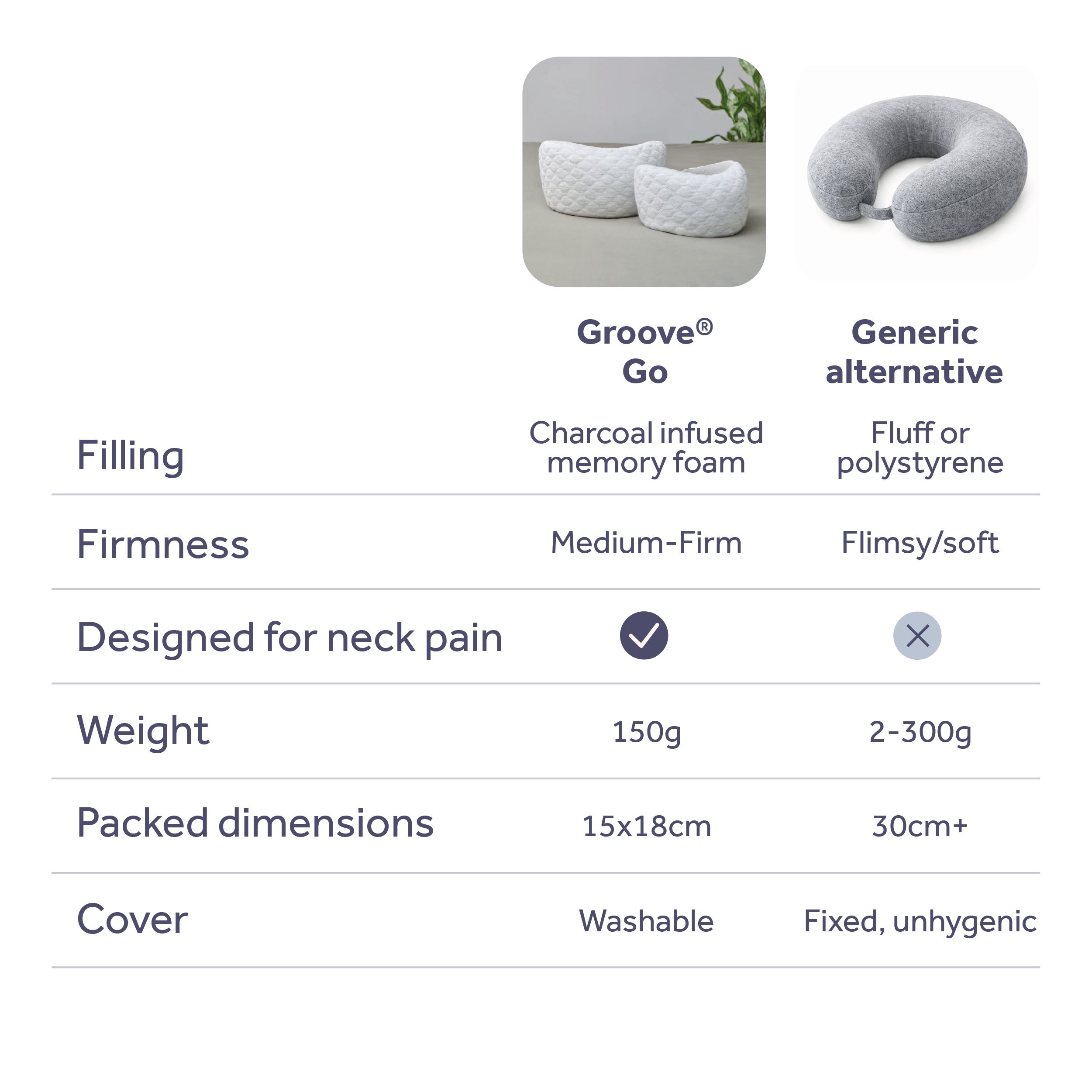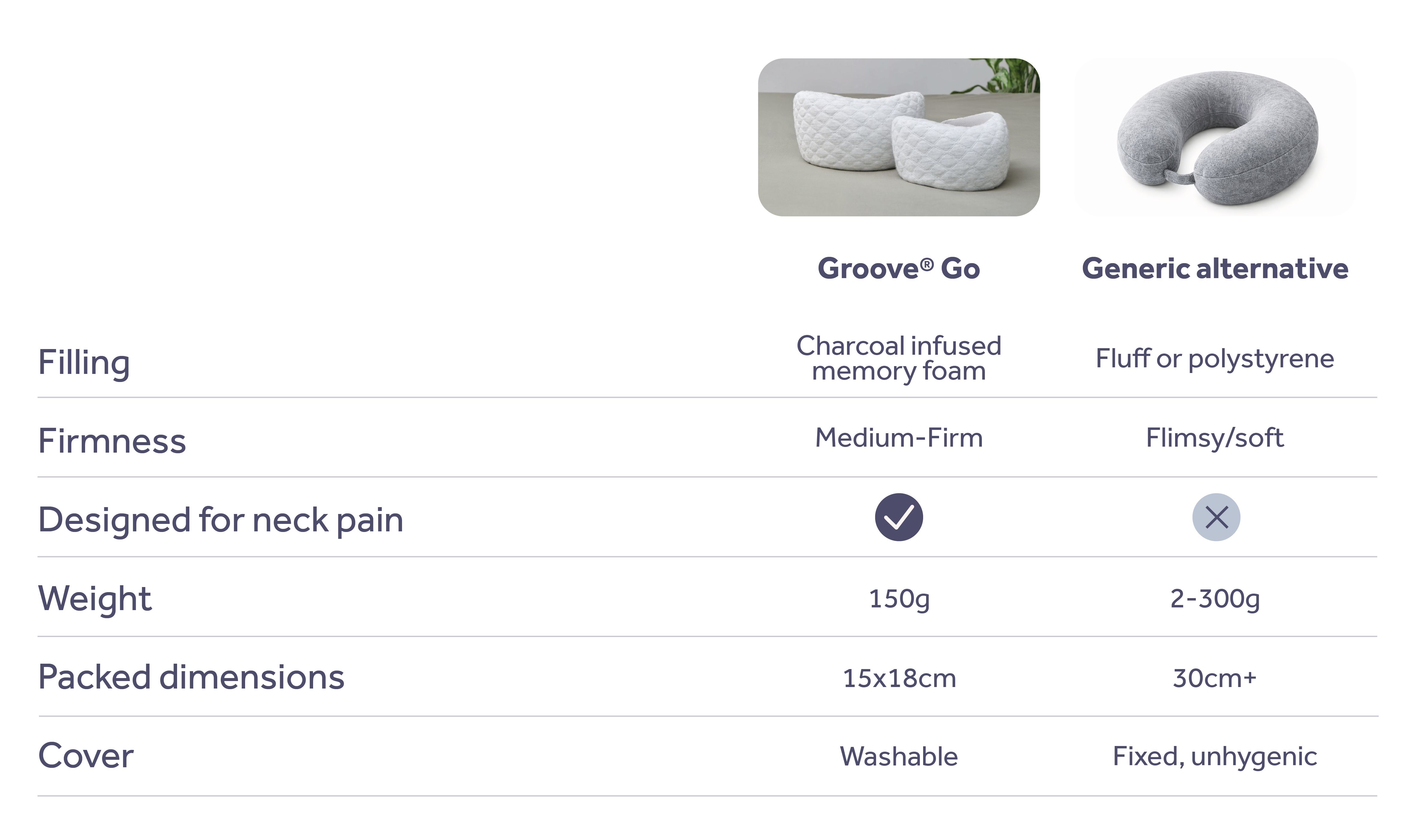 With the Groove® award-winning ergonomic memory foam our Go Travel Pillow offers lighter, cooler neck support for anyone suffering with neck soreness or stiffness during travel.